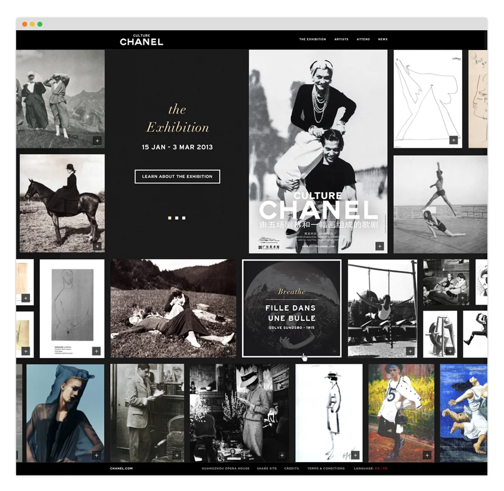 Chanel is revered as a cultural institution in the fashion world. Since creating "the little black dress" they have long been the epitome of haute culture. But they had a problem; when attempting to infiltrate the growing Chinese market they realized that there was a lack of brand recognition and understanding of their cultural significance within the fashion world. So they decided to host a traveling exhibition called "Culture Chanel" to educate the Chinese public about Chanel. The digital exhibition is the online component of "Culture Chanel" and can be translated for English, French and Chinese audiences.